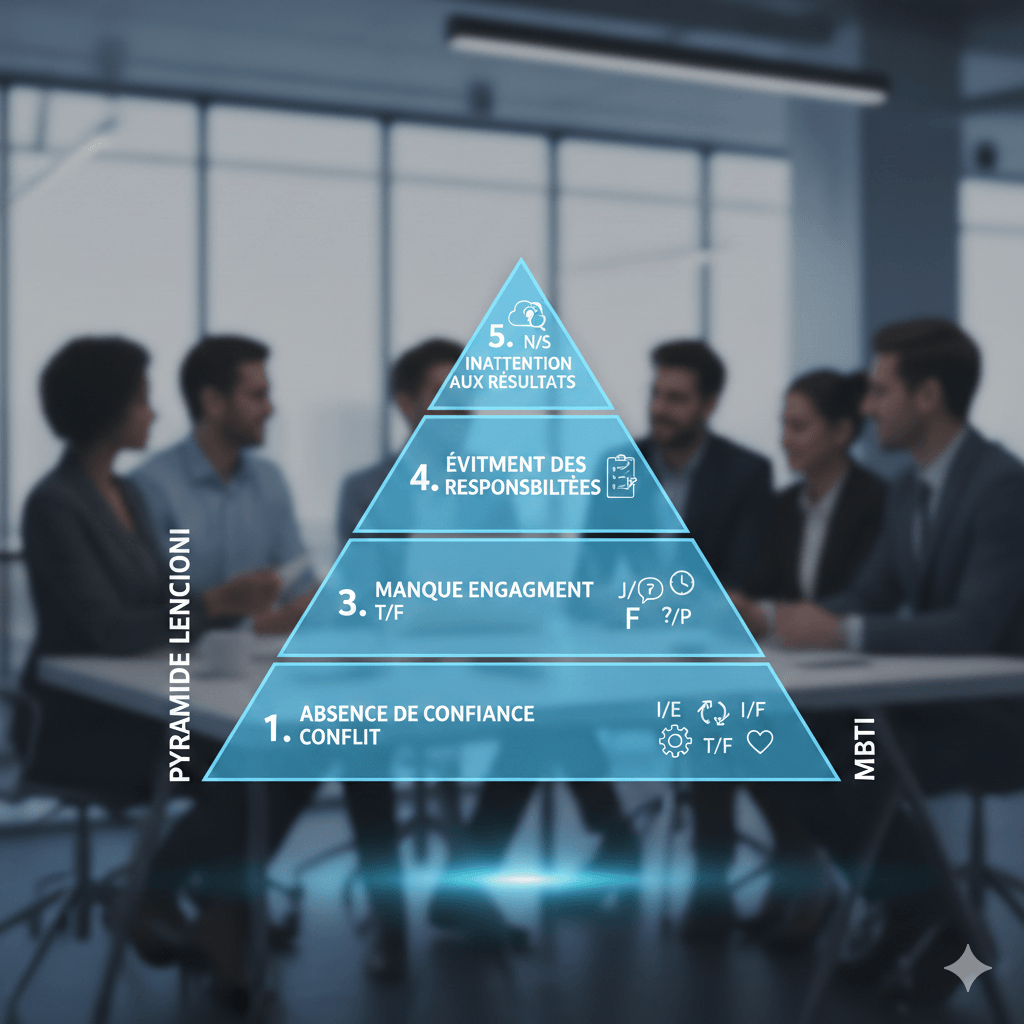 ✨ Atelier sur 1 journée avec lecture du Profil MBTI équipe et réflexion individuelle et collective sur les 5 niveaux de dysfonctionnement (confiance, conflit, engagement, responsabilités, résultats)